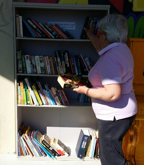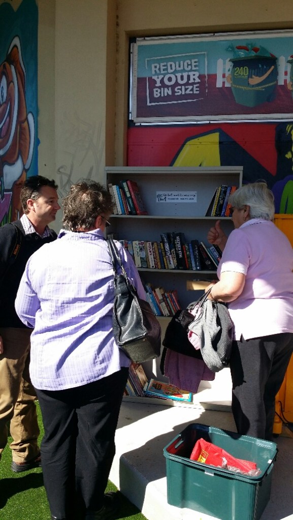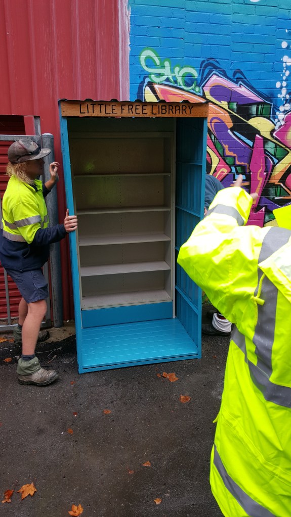 Council staff picked up the finished library from the Men’s Shed and placed it in the laneway. Books were sourced (from memory) from both the City Library and gifted by local Opportunity Shops.